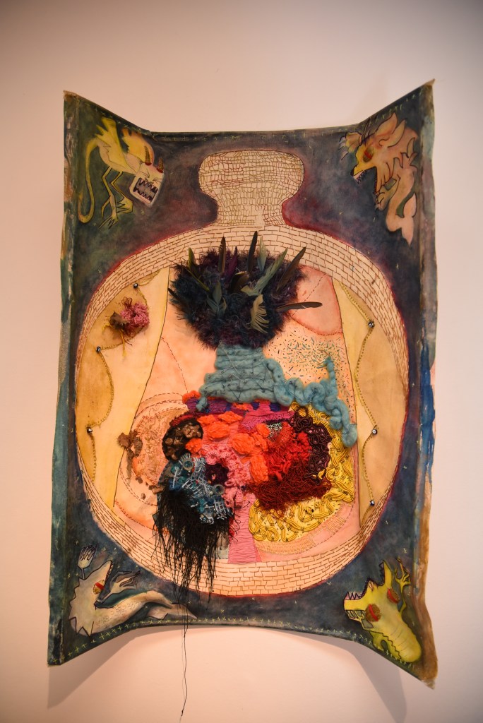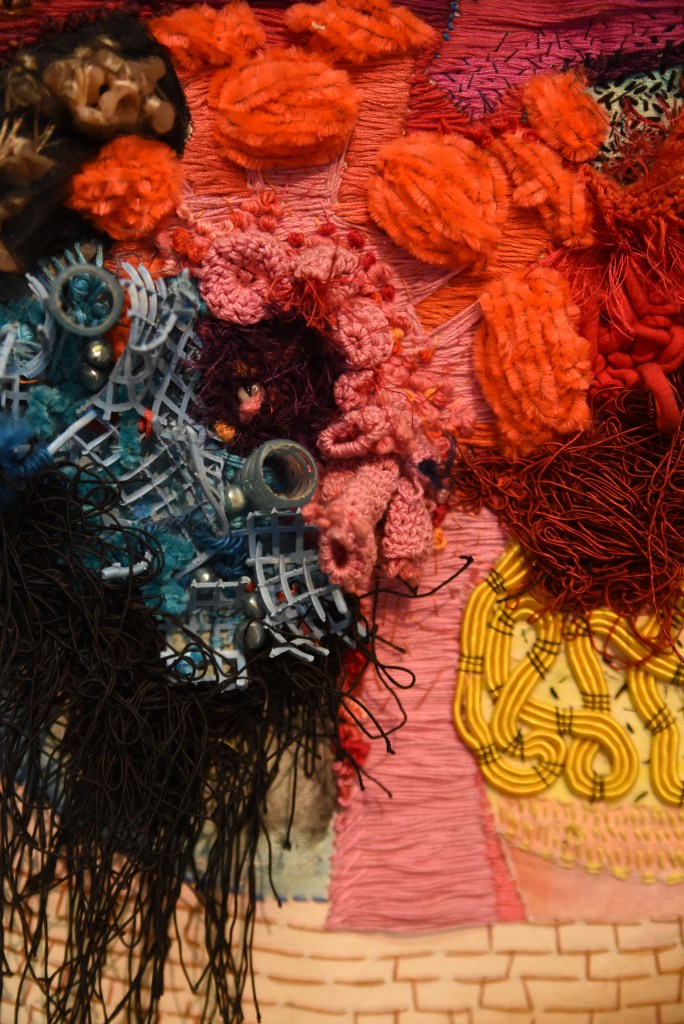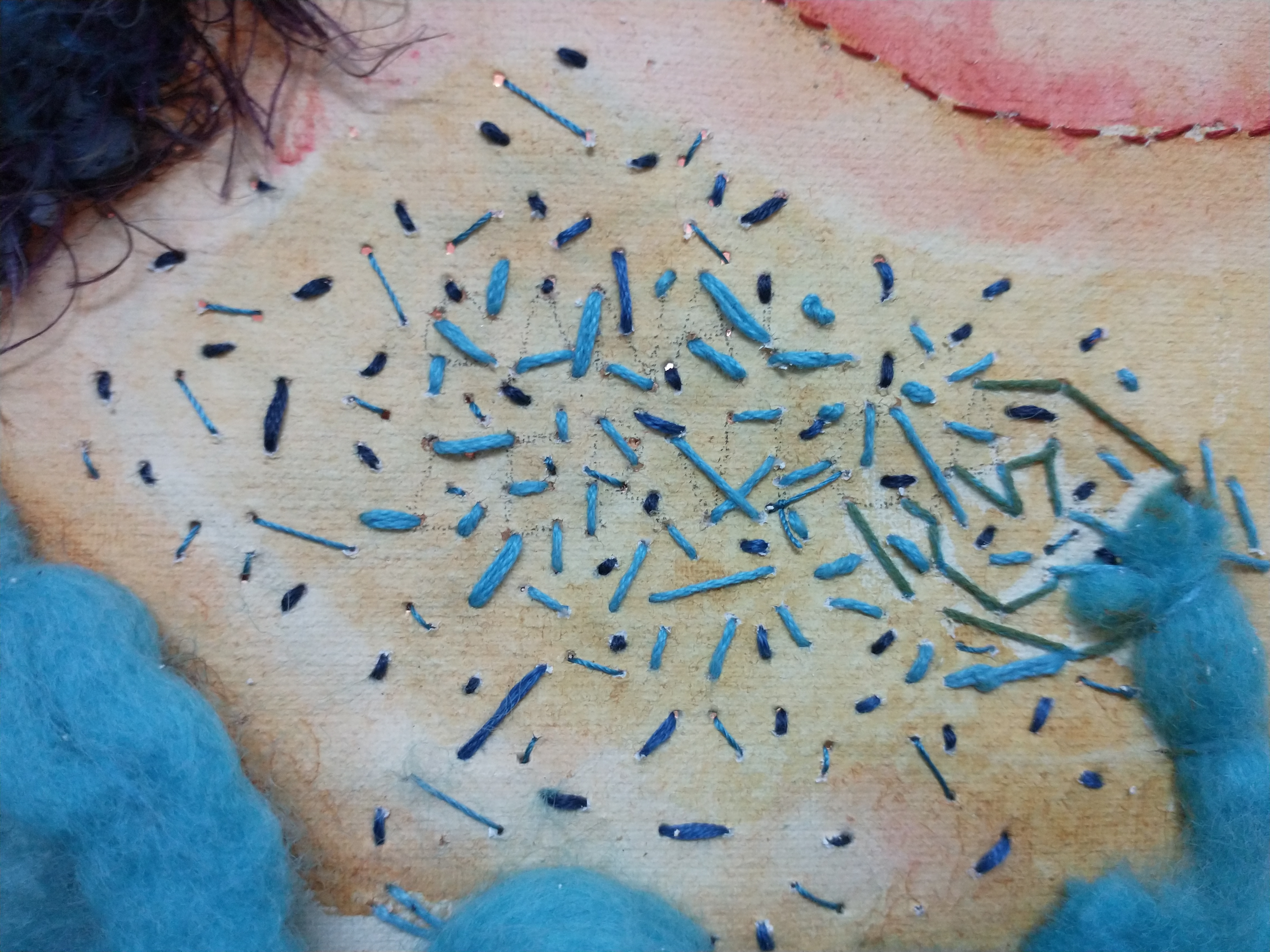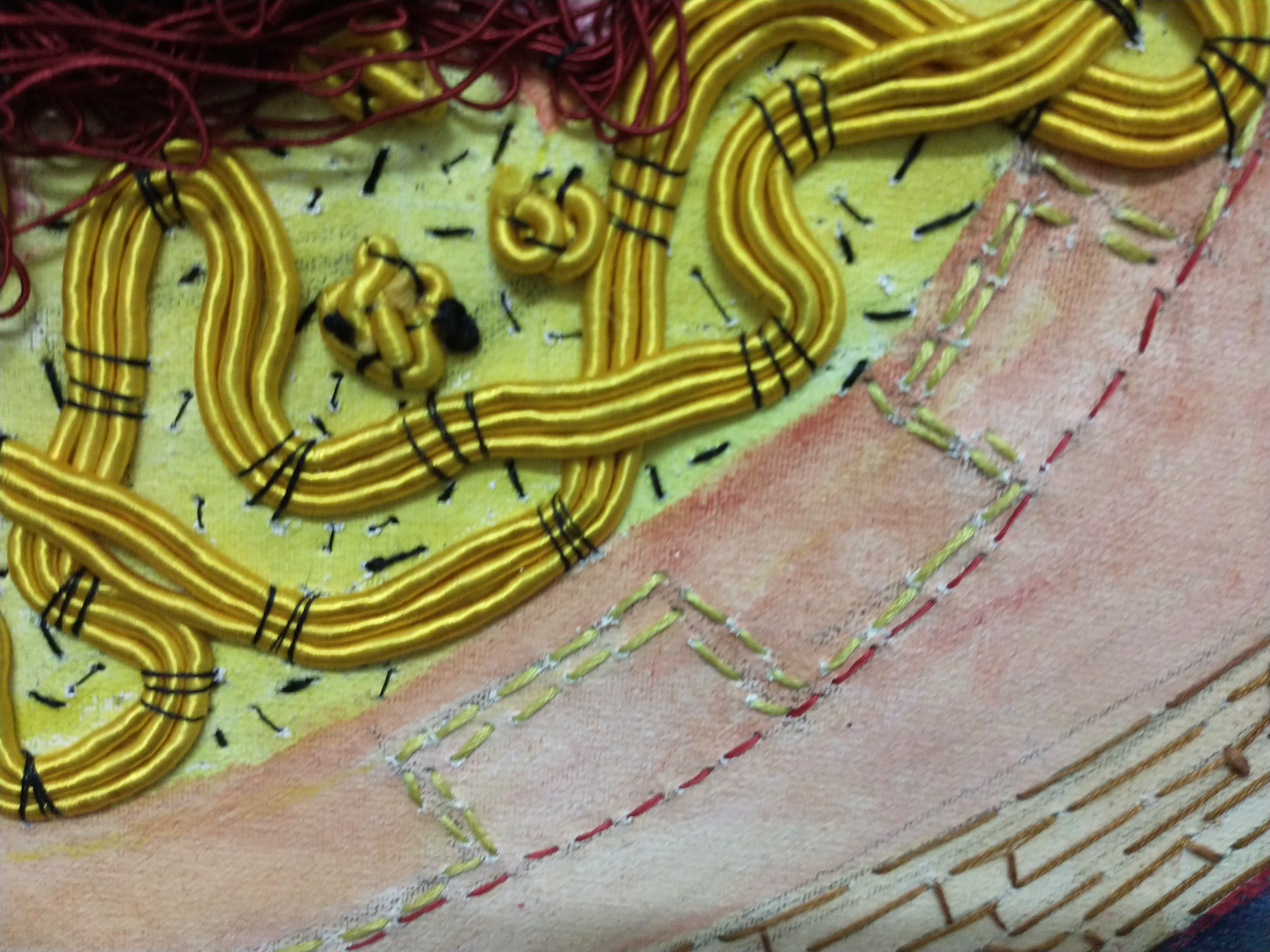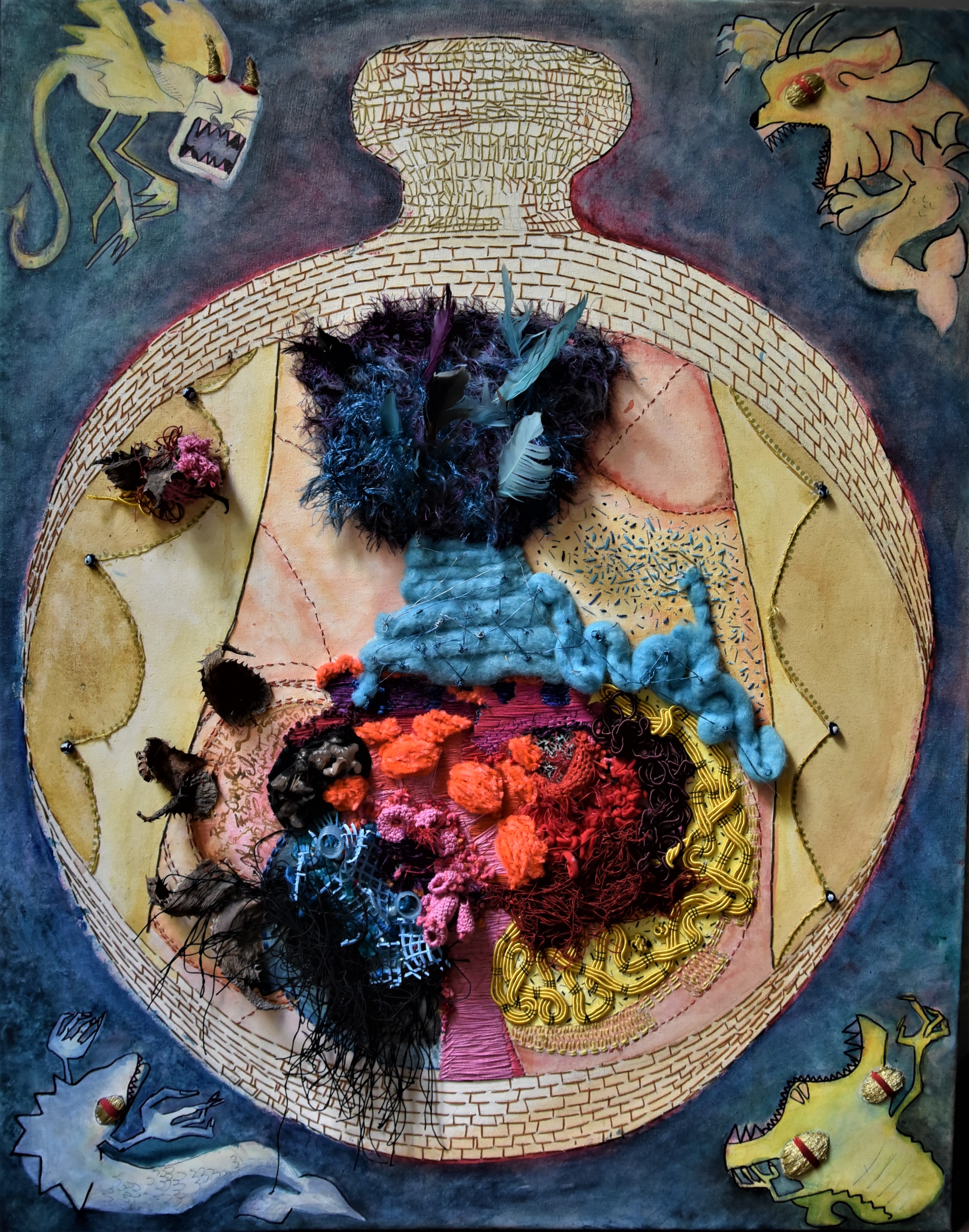 bordado, acrílico, vidrio Murano, cera, plumas sobre lienzo
